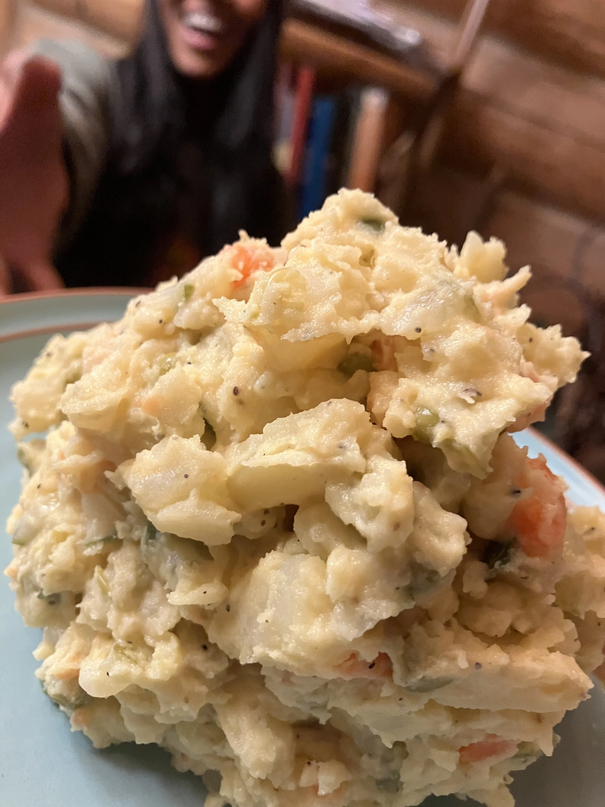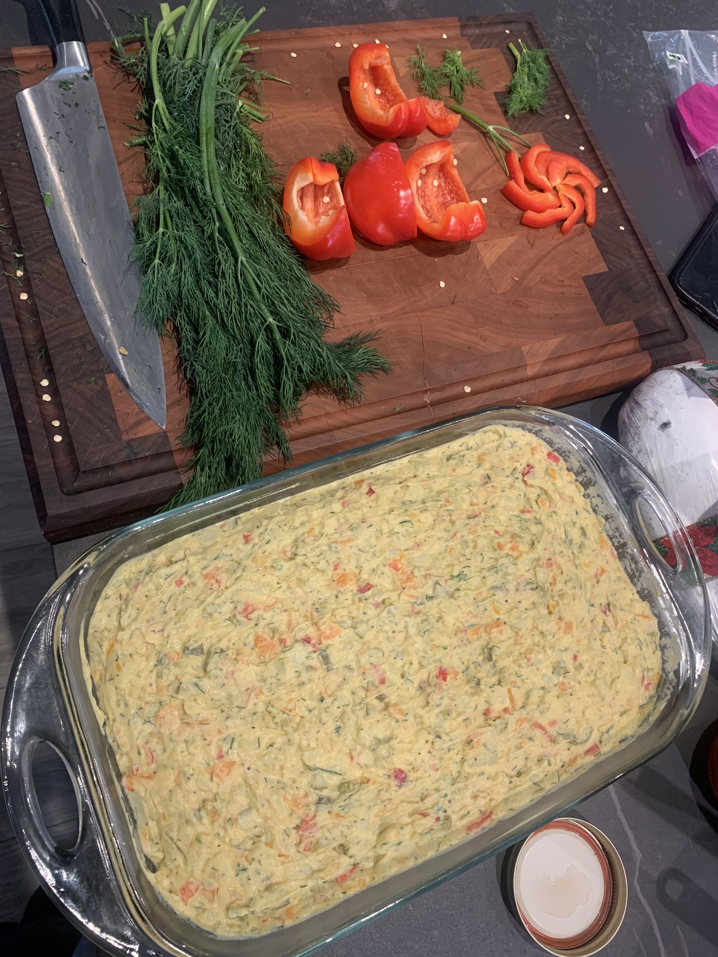 7. Optional - Add the traditional flair: Transfer the potato salad into a serving dish and spread a thin coat of mayo over the top. Decorate with boiled, egg, red pepper, dill leaves, or anything else that excites you!